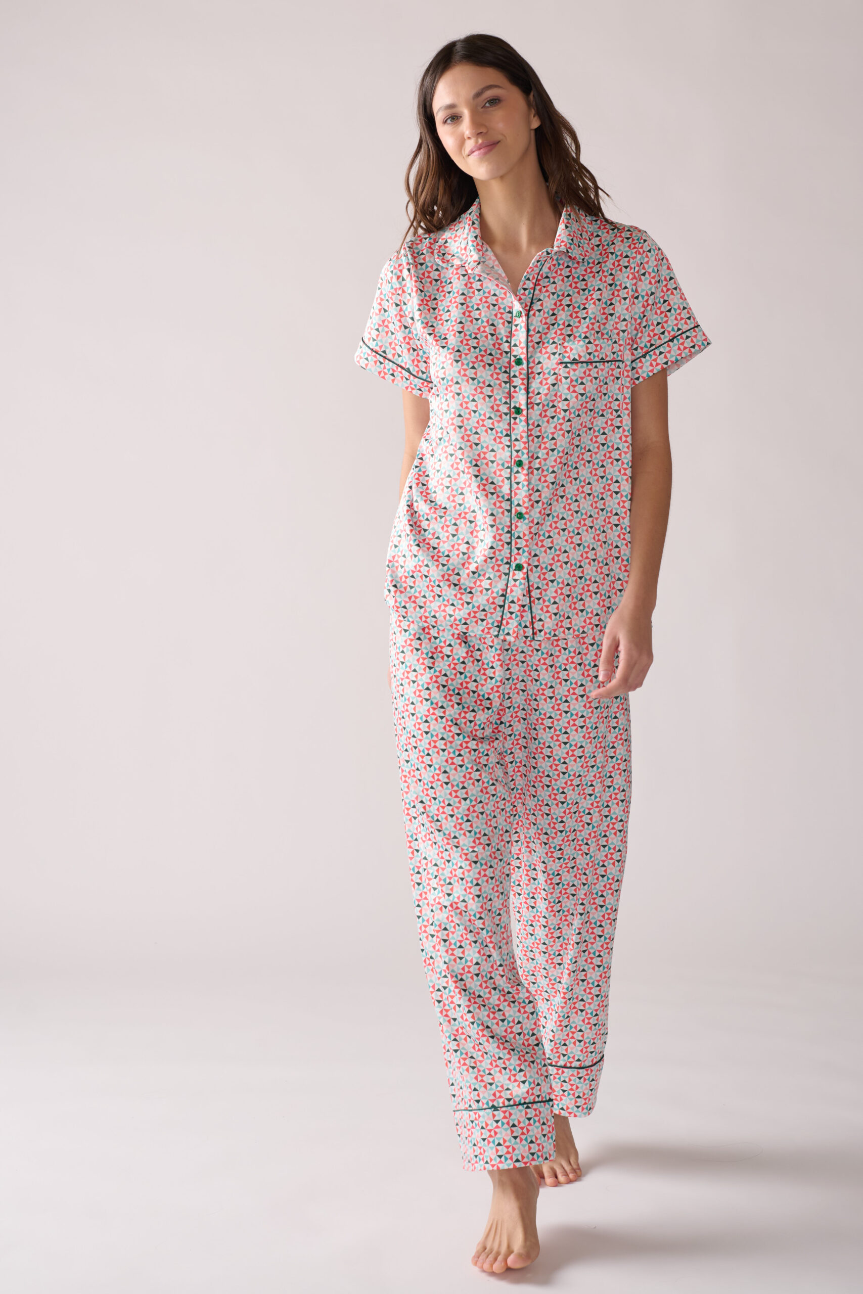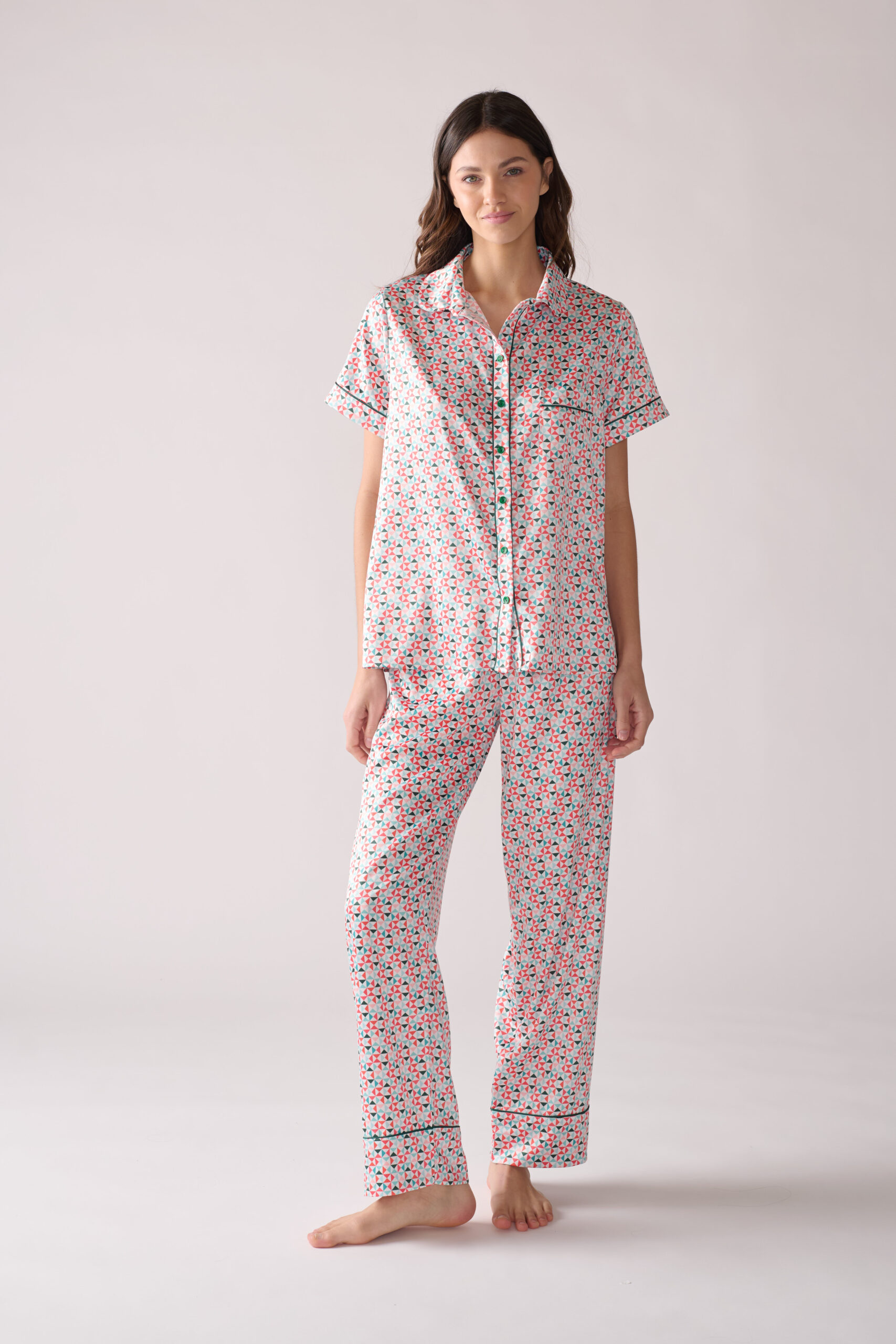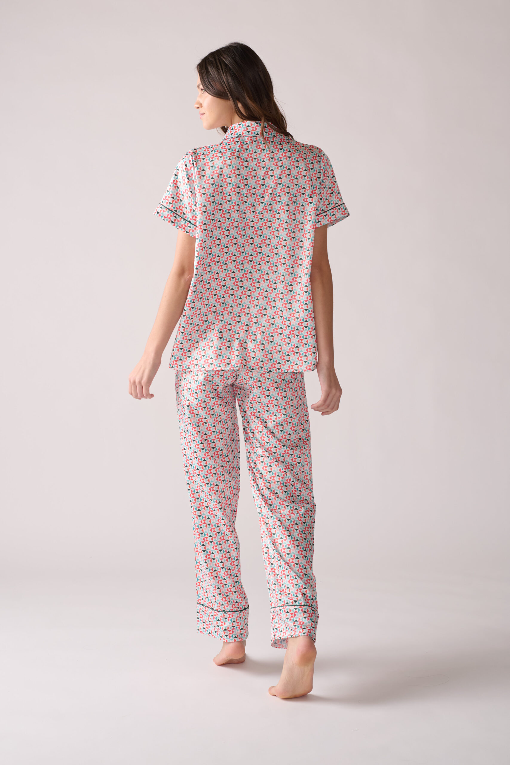 Nuestro estilo más vendido y más antiguo en ZTELLA, la pijama de seda con ajuste holgado. El conjunto de pantalon y camisa manga corta está confeccionado en seda poliester adornado con un estampado moderno. Terminada con ocho botones de nácar tinturados y ribete de seda, este diseño de pantalon con corte recto tiene paneles elásticos a lo largo de la cintura baja para garantizar que se ajuste correctamente.