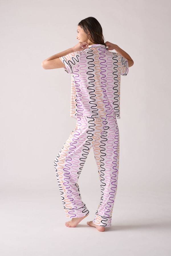 Nuestro estilo más vendido y más antiguo en ZTELLA ahora en jersey. El conjunto pantalon y camisa está confeccionado en tejido de punto y adornado con un estampado moderno. La camisa terminada con ocho botones de nácar tinturados y ribete de seda, este diseño de pantalon con corte recto tiene elástico a lo largo de la cintura para garantizar que se ajuste correctamente.
