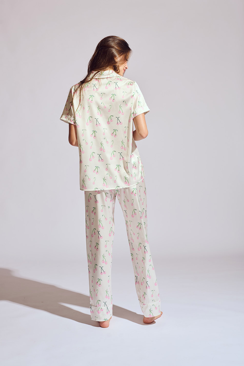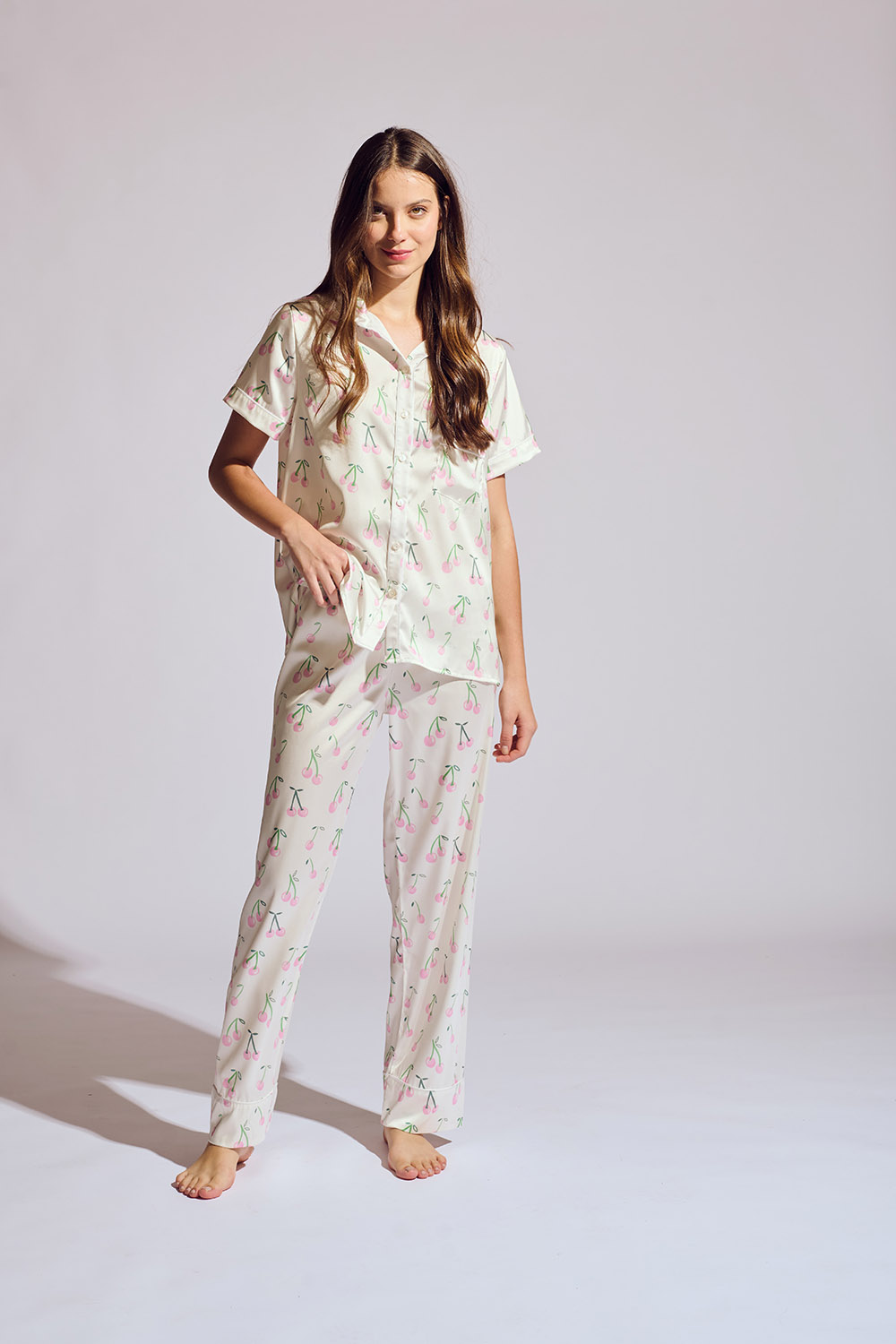 Nuestro estilo más vendido y más antiguo en ZTELLA, la pijama de seda con ajuste holgado. El conjunto de pantalon y camisa manga corta está confeccionado en seda poliester adornado con un estampado moderno. Terminada con ocho botones de nácar tinturados y ribete de seda, este diseño de pantalon con corte recto tiene paneles elásticos a lo largo de la cintura baja para garantizar que se ajuste correctamente.