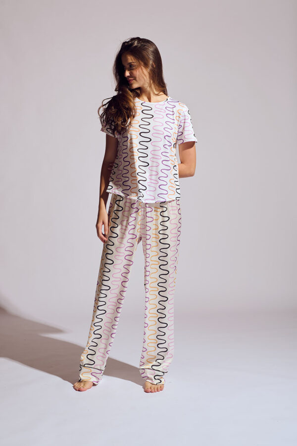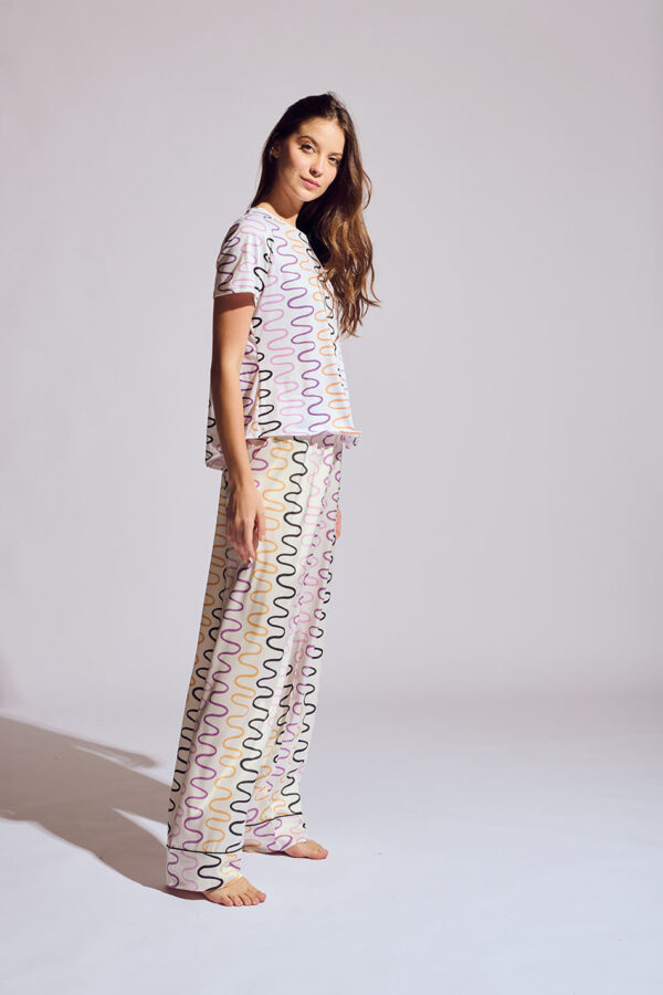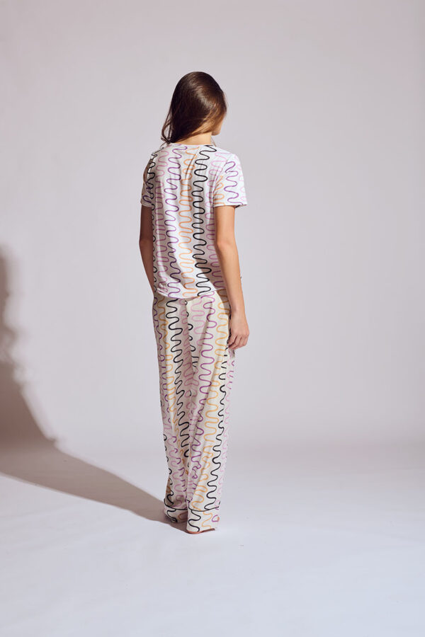 Nuestro estilo más versatil y juvenil en ZTELLA, la pijama de tshirt. El conjunto pantalon y tshirt está confeccionado en tejido de punto y adornado con un estampado moderno. Terminada con dos botones de nácar tinturados y ribete de satin, este diseño de pantalon con corte recto tiene paneles elásticos a lo largo de la cintura baja para garantizar que se ajuste correctamente.