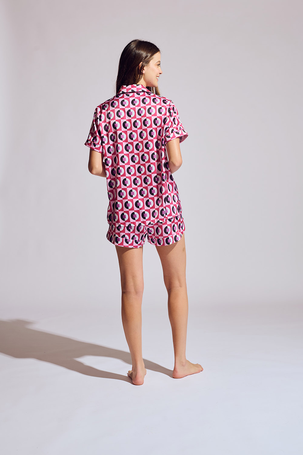 Nuestro estilo más vendido y más antiguo en ZTELLA, la pijama de seda. El conjunto short y camisa manga corta está confeccionado en seda poliester y adornado con un estampado moderno. Terminada con ocho botones de nácar tinturados y ribete de seda, este diseño de short tiene paneles elásticos a lo largo de la pretina completa para garantizar que se ajuste correctamente.