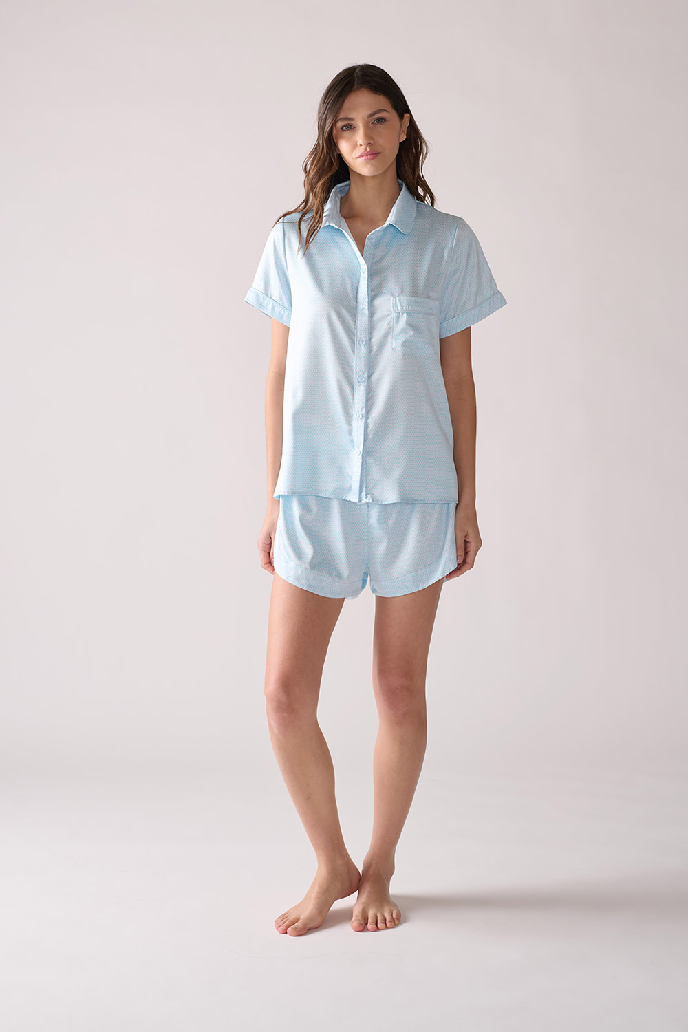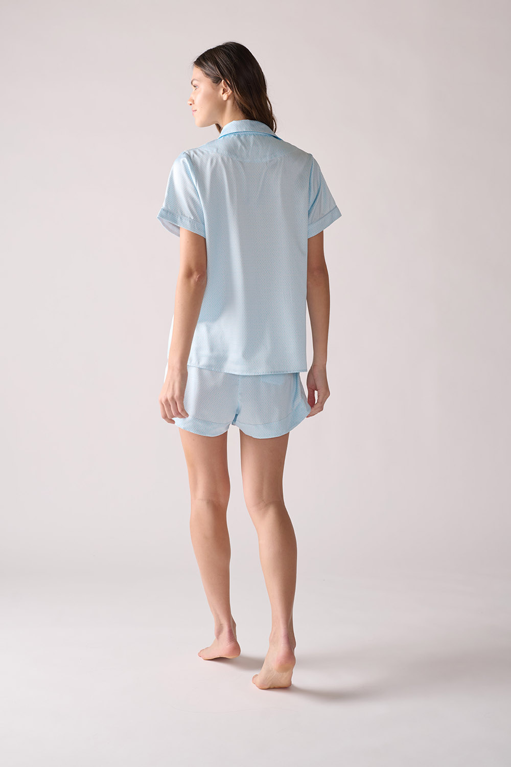 Nuestro estilo más vendido y más antiguo en ZTELLA, la pijama de seda. El conjunto short y camisa manga corta está confeccionado en seda poliester y adornado con un estampado moderno. Terminada con ocho botones de nácar tinturados y ribete de seda, este diseño de short tiene paneles elásticos a lo largo de la pretina completa para garantizar que se ajuste correctamente.