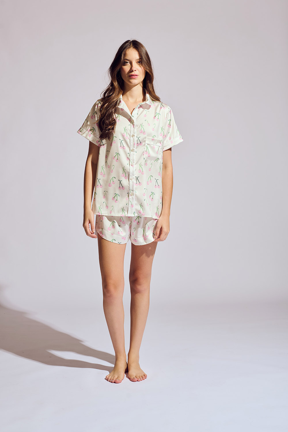 Nuestro estilo más vendido y más antiguo en ZTELLA, la pijama de seda. El conjunto short y camisa manga corta está confeccionado en seda poliester y adornado con un estampado moderno. Terminada con ocho botones de nácar tinturados y ribete de seda, este diseño de short tiene paneles elásticos a lo largo de la pretina completa para garantizar que se ajuste correctamente.