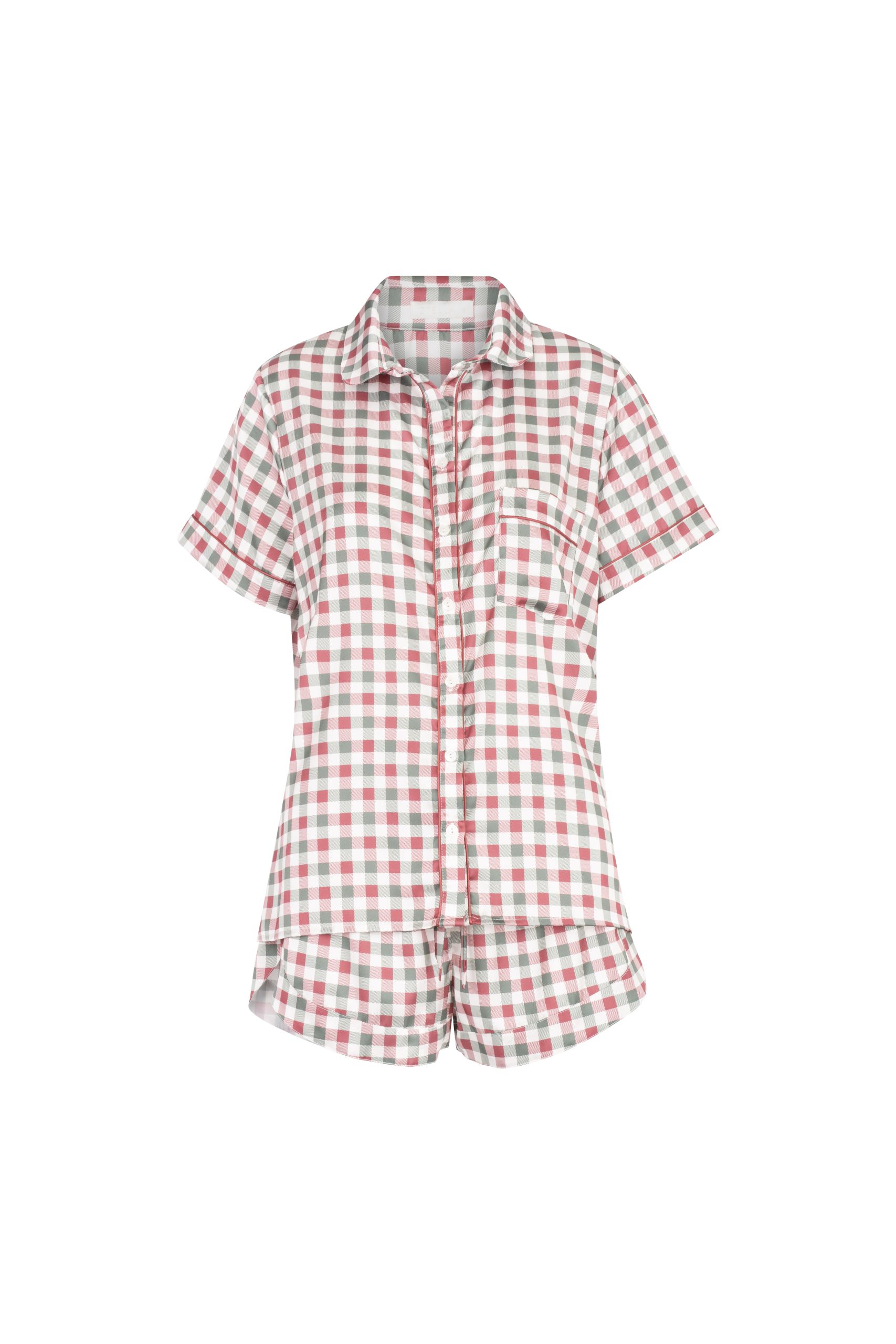 Nuestro estilo más vendido y más antiguo en ZTELLA, la pijama de seda. El conjunto short y camisa manga corta está confeccionado en seda poliester y adornado con un estampado moderno. Terminada con ocho botones de nácar tinturados y ribete de seda, este diseño de short tiene paneles elásticos a lo largo de la pretina completa para garantizar que se ajuste correctamente.